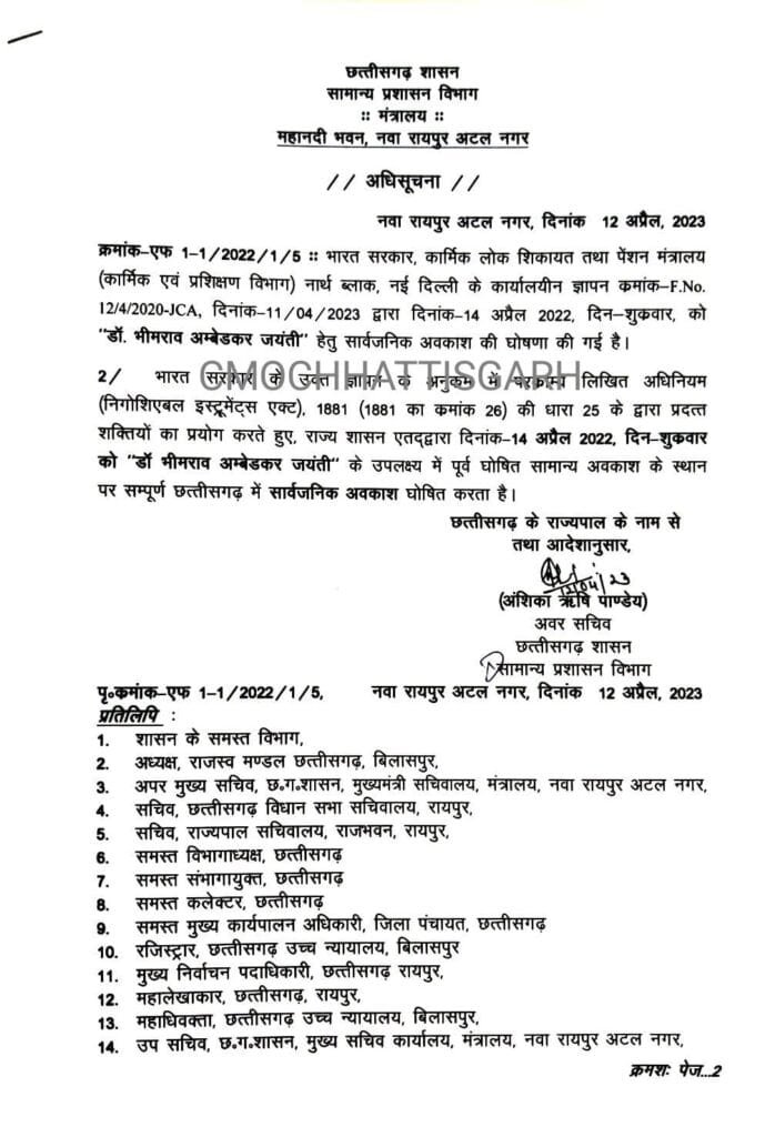 रायपुरःअंबेडकर जयंती पर छत्तीसगढ़ सरकार ने सार्वजनिक अवकाश की घोषणा की है। भारत सरकार के निर्देश के बाद छत्तीसगढ़ शासन के सामान्य प्रशासन विभाग ने इस संबंध में आदेश जारी कर दिया है। दरअसल 11 अप्रैल 2023 को भारतीय राजपत्र में जारी जारी सूचना के अनुसार भारत सरकार द्वारा डॉ. भीमराव अंबेडकर जयंती पर 14 अप्रैल को पूरे भारत देश में अवकाश घोषित किया गया है। इस संबंध केंद्र ने राज्यों को भी सूचना भेजी थी। जिसके बाद अब छत्तीसगढ़ सरकार ने भी छुट्टी को लेकर अधिसूचना जारी कर दी है।