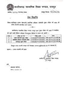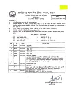 छत्तीसगढ़ माध्यमिक शिक्षा मंडल ने हाईस्कूल, हायर सेकेंडरी मुख्य परीक्षा 2025 की समय सारणी जारी कर दी है. हायर सेकेंडरी की मुख्य परीक्षा 1 मार्च से 28 मार्च तक होगी. वहीं हाईस्कूल की बोर्ड परीक्षा 3 मार्च से 24 मार्च तक आयोजित होगी. दोनों परीक्षाएं सुबह की पाली में आयोजित की जाएगी.