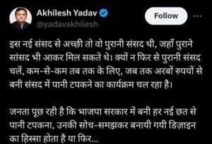 सपा प्रमुख अखिलेश यादव ने ट्विटर पर एक वीडियो जारी करते हुए लिखा, ‘इस नई संसद से अच्छी तो वो पुरानी संसद थी, जहां पुराने सांसद भी आकर मिल सकते थे। क्यों न फिर से पुरानी संसद चलें, कम-से-कम तब तक के लिए, जब तक अरबों रुपयों से बनी संसद में पानी टपकने का कार्यक्रम चल रहा है। जनता पूछ रही है कि भाजपा सरकार में बनी हर नई छत से पानी टपकना, उनकी सोच-समझकर बनायी गयी डिज़ाइन का हिस्सा होता है या फिर…।’